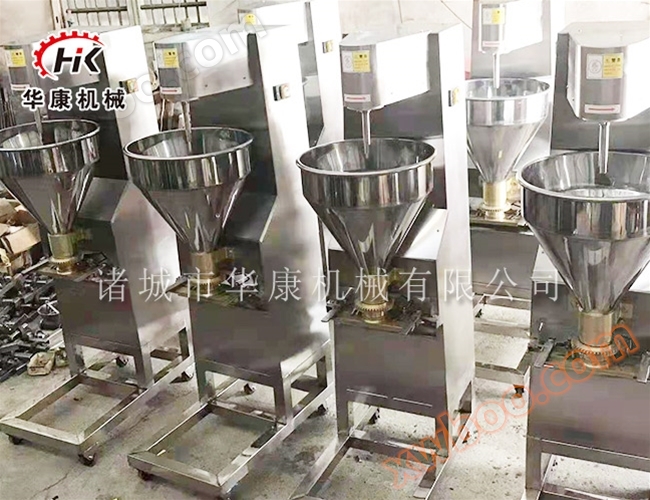 肉丸机一般由绞肉机、打浆机、成型机组成。根据所做肉丸的肉类不同,打浆又分为高速打浆机和慢速打浆机。以做猪肉为例,先浆肉清理好,通过绞肉机绞成肉碎。再放入高速打浆机内打成肉茸,然后放入成型机内制成圆形物。包心肉丸机选用不锈钢材质,丸子直径18-25mm和25-35mm两种,内包馅料的多少能自由调节,可以制作各种爽脆,有韧性,有弹性的包心肉丸,包心鱼丸等。