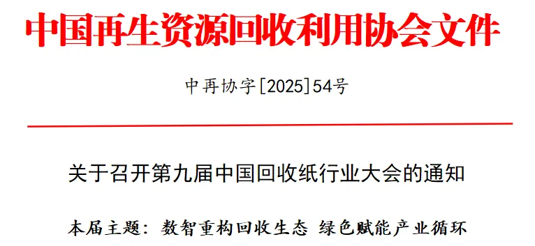 为深入剖析回收体系面临的深刻变革,探讨回收纸行业“十五五”发展方向,凝聚发展共识,搭建合作桥梁,中国再生资源回收利用协会废纸分会将于2025年11月25日-27日在天津召开第九届中国回收纸行业大会,本届大会以“数智重构回收生态,绿色赋能产业循环”为主题,探讨如何通过数智化、绿色化重构回收体系,实现回收纸产业链价值共赢。同期召开中再生协会废纸分会三届四次理事会,现将主要内容通知如下: