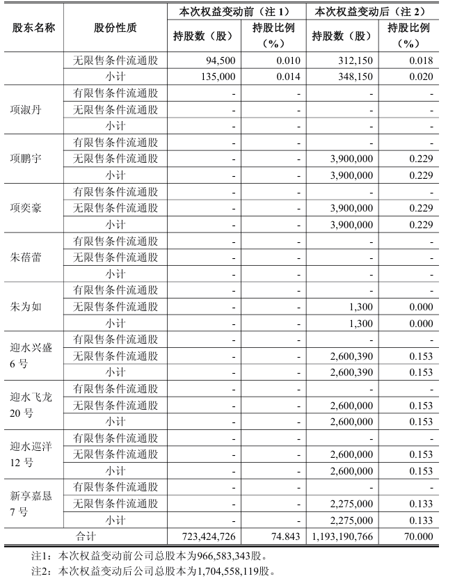 本次权益变动方式为信息披露义务人主动减持、主动增持、获授限制性股票、上市公司限制性股票回购注销导致信息披露义务人持股比例被动增加、可转债转股导致持股比例被动下降。本次权益变动前,信息披露义务人持有伟明环保723,424,726股,占公司总股本的比例为74.843%。本次权益变动后,信息披露义务人持有公司股份的比例下降至70.000%。本次权益变动对上市公司控制权没有影响,项光明、王素勤、朱善玉和朱善银为实际控制人。