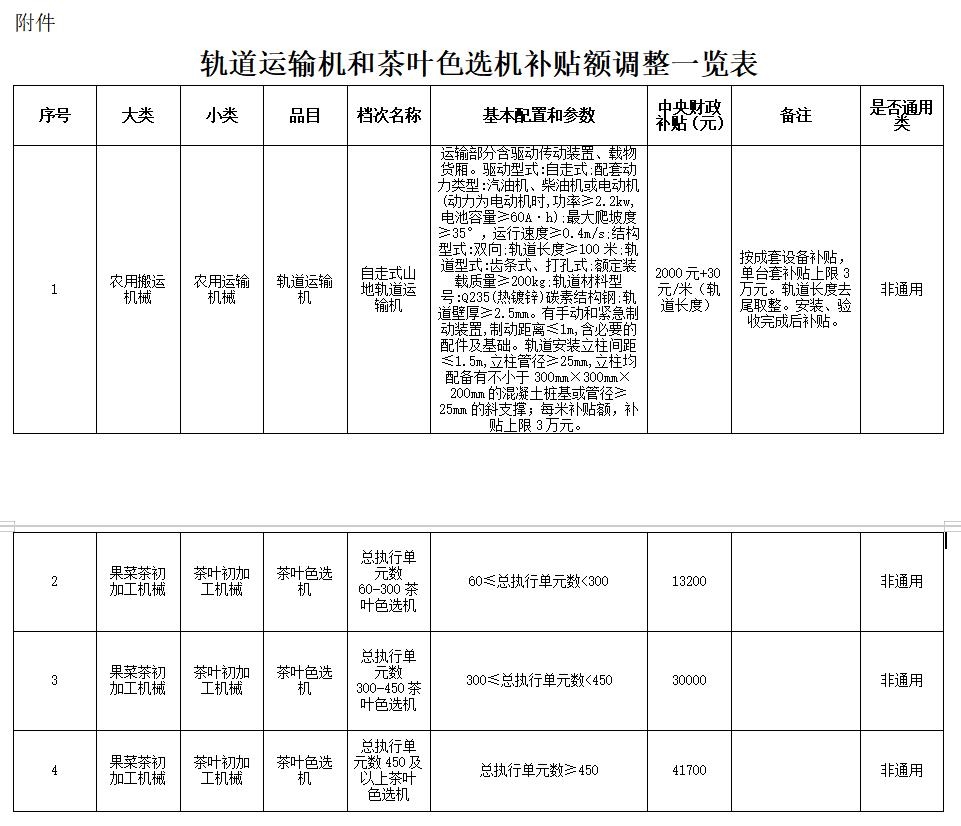 附件:轨道运输机和茶叶色选机补贴额调整一览表