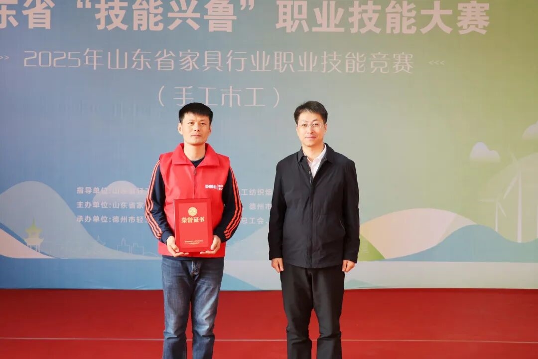 颁奖仪式环节,山东省家具协会执行会长韩庆生作总结发言。他表示,本次赛事成功选拔出一批技艺精湛、素养过硬的青年技能人才,为全省家具行业注入新鲜活力。下一步,山东省家具协会将以 “以赛促训、以赛育才” 为核心抓手,持续优化竞赛体系,推动技能标准与产业需求深度融合,推动全省家具产业实现高质量发展。