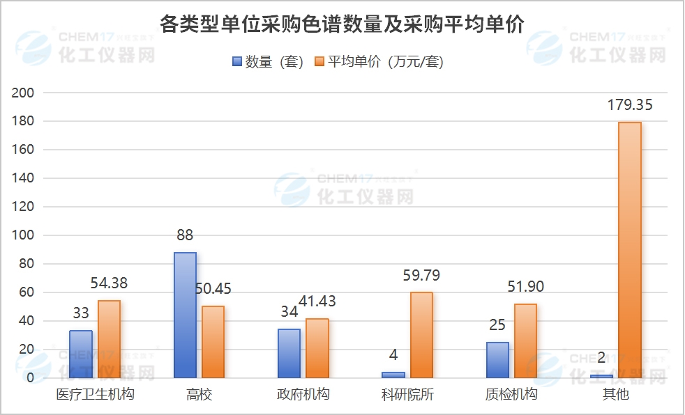 从平均采购单价来看,10月各单位采购色谱仪的平均单价在41-179万元/套之间。其中,其他类型机构的平均采购单价最高,采购平均单价为179.35万元/套;其次为科研院所,采购平均单价为59.79万元/套。