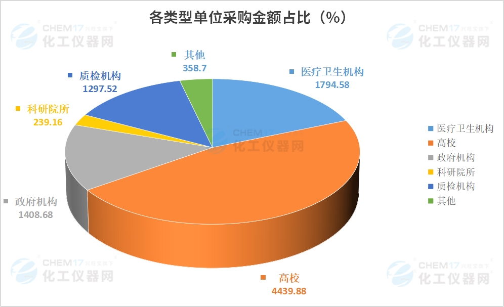 医疗卫生机构采购数量为33套,采购金额为1794.58元,约占10月色谱仪采购总金额的18.81%;政府机构采购数量为34套,采购金额为1408.68万元,约占10月色谱仪采购总金额的14.77%;科研院所采购数量为4套,采购金额为239.16万元,约占10月色谱仪采购总金额的2.51%;质检机构采购数量为25套,采购金额为1297.52万元,约占10月色谱仪采购总金额的13.6%;其他类型机构采购数量为2套,采购金额为358.7万元,约占10月色谱仪采购总金额的3.76%。