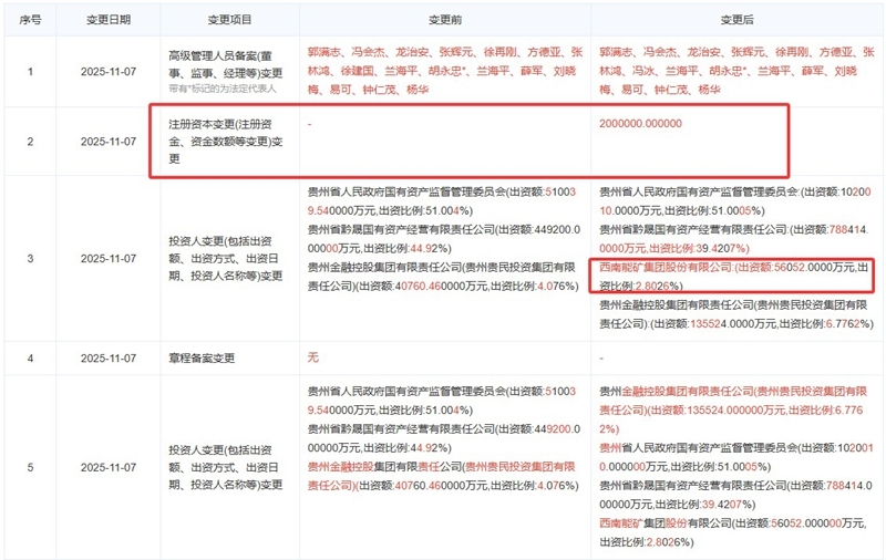 据爱企查,贵州能源集团有限公司近日发生工商变更,新增西南能矿集团股份有限公司为股东,注册资本由100亿元人民币增至200亿元人民币,增幅100%。与此同时,部分高管也发生变更。