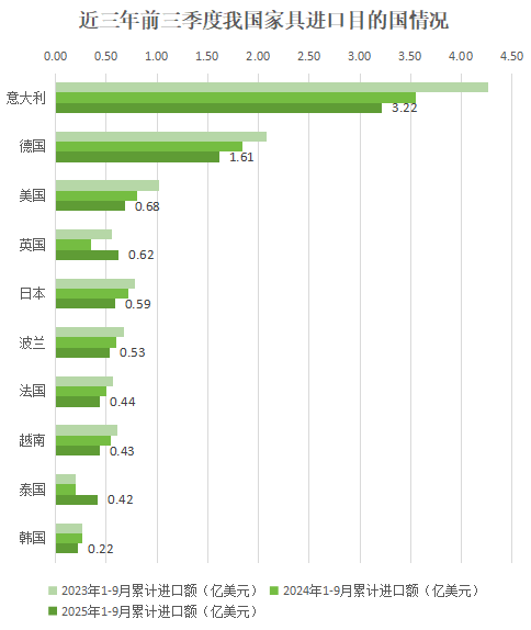 分国别来看,2025年前三季度,我国家具商品进口额前10的来源国依次是意大利、德国、美国、英国、日本、波兰、法国、越南、泰国、韩国,占全部进口的77.8%。其中28.6%的进口家具来自意大利,14.3%进口自德国,6.0%进口自美国。