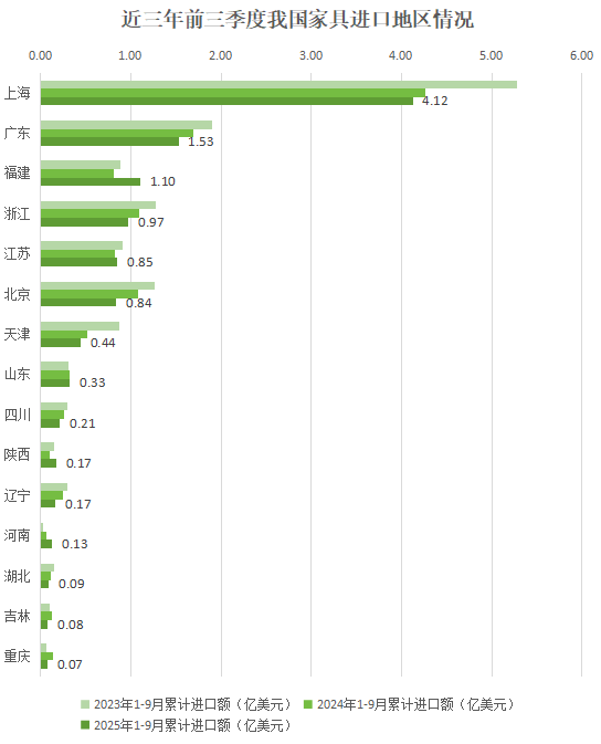 2025年前三季度,我国家具行业累计进口额11.27亿美元,比2024年同期下降6.6%,比2023年同期下降20.4%。一季度进口3.52亿美元,同比上年下降7.2%;二季度进口3.63亿美元,同比上年下降11.9%;三季度进口4.12亿美元,同比上年下降0.9%。