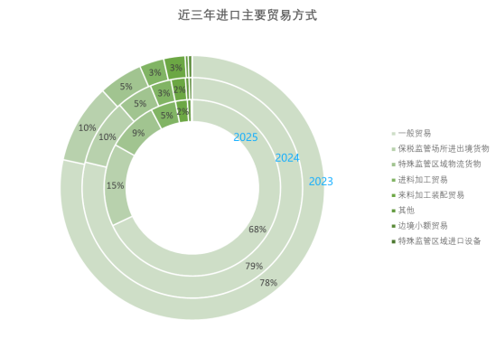 从进口金额同比来看,其他贸易方式在传统进口贸易方式连续下降的情况下连续两年正增长,其中包括如跨境电商等模式。此外,保税监管场所进出境货物、特殊监管区域物流货物、进料加工贸易三种贸易方式在2025年均有不同程度的正增长,反映了进口市场进入多元化发展阶段。