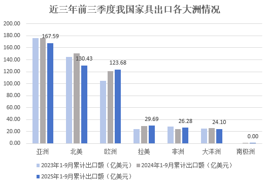 2025年前三季度,中国家具商品出口集中在亚洲、北美、欧洲市场,约占全部出口的80.0%。其中,出口亚洲市场167.59亿美元,占全部出口额(下同)的33.4%;出口北美市场130.43亿美元,占26.0%;出口欧洲市场123.68亿美元,占24.7%;出口拉美市场29.69亿美元,占5.9%;出口非洲26.28亿美元,占5.2%;出口大洋洲市场24.10亿美元,占4.8%;出口南极洲极少。