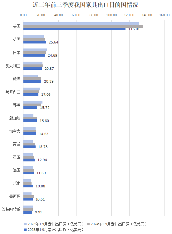分国别来看,2025年前三季度我国出口前15的国家依次为美国、英国、日本、澳大利亚、德国、马来西亚、韩国、新加坡、加拿大、荷兰、泰国、法国、越南、墨西哥、沙特阿拉伯,占全部出口的67.7%。其中美国仍是主要家具出口目的国,占比23.1%。