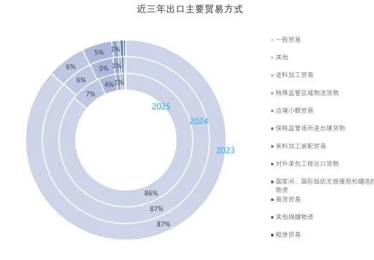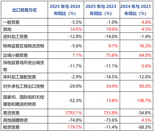 从出口金额同比来看,2025年前三季度出口额低于2024年,导致各贸易方式出口同比整体下降。值得一提的是,其他贸易方式和边境小额贸易方式连续两年正增长,反映出政策驱动下的边境贸易活跃及企业主动寻求出口模式创新的转变。