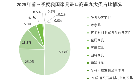 按九大类商品来看,2025年前三季度,坐具及其零件同比下降4.8%,占全部进口额的50.4%;木家具同比下降5.2%,占25.0%;其他材料制家具及家具零件同比下降6.0%,占13.3%;金属家具同比增长2.6%,占5.9%;医用家具同比下降5.2%,占4.1%;塑料家具同比下降5.3%,占0.5%;弹簧床垫同比下降76.1%,占0.5%;牙科、理发椅及其零件同比增长26.0%,占0.2%;竹、藤、柳条及类似材料制家具同比下降31.4%,占比极少。