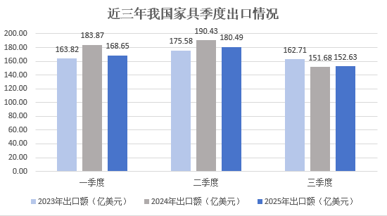 2025年前三季度,我国家具行业累计出口额501.77亿美元,比2024年同期下降4.6%,比2023年同期减少0.1%。一季度出口168.65亿美元,增速同比2024年下降8.3%,同比2023年增加3.0%;二季度出口180.49亿美元,增速同比2024年下降5.2%,同比2023年增加2.8%;三季度出口回落至152.63亿美元,增速同比2024年增加0.6%,同比2023年下降6.2%。