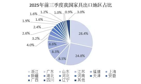 2025年前三季度,我国家具商品出口额前15的地区依次为浙江、广东、山东、江苏、福建、上海、新疆、湖北、河北、河南、天津、安徽、广西、四川、辽宁,占全部地区出口的97.0%。其中,浙江占比28.4%位居第一,广东占比24.8%位居第二,山东占比8.5%位居第三。