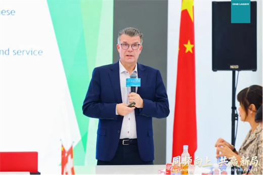 作为大会核心环节,迪能激光全球 CEO 游松博士发表主题演讲,深度解读DNE LASER品牌独立运营后的全球化战略布局。他指出,迪能激光以青绿色为新标识的品牌升级,寓意 “从成熟通向新生”,更承载着 “Driving New Eras(驱动新时代)”的发展使命。在瑞士百超集团双品牌战略框架下,迪能激光与瑞士百超形成精准的市场互补,将依托佛山基地的供应链优势,高效辐射全球市场。