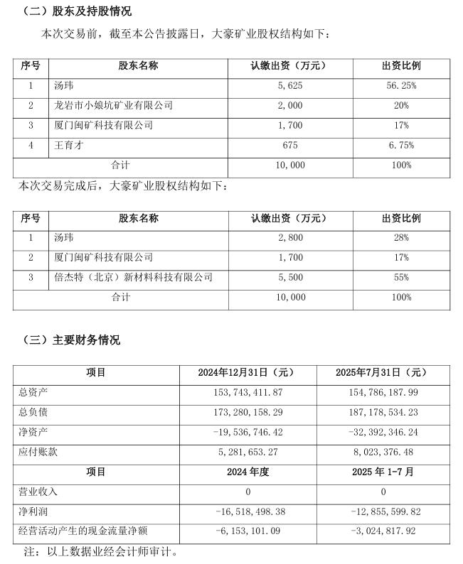 11月19日晚间,上市水处理企业倍杰特集团股份有限公司(简称:倍杰特)公告称,全资子公司倍杰特(北京)新材料科技有限公司(下称“倍杰特新材料”)拟以自有资金或自筹资金22,480.00万元收购汤玮、龙岩市小娘坑矿业有限公司(简称“小娘坑矿业”)、王育才合计持有的文山州大豪矿业开发有限公司(下称“大豪矿业”)55%股权。本次交易完成后,大豪矿业纳入公司合并报表范围。