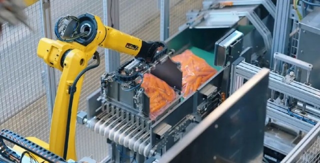 基于过往在土豆包装线自动化项目中的成功合作与良好体验,在胡萝卜包装线,Inoverde再次选择发那科机器人包装自动化解决方案,核心是由三台发那科机器人组成的无缝协作系统: