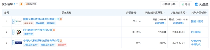 股东信息显示,该公司由国能大渡河流域水电开发有限公司持股56.11%、四川铁能电力开发有限公司持股33.89%、宁德时代新能源科技股份有限公司持股10%。