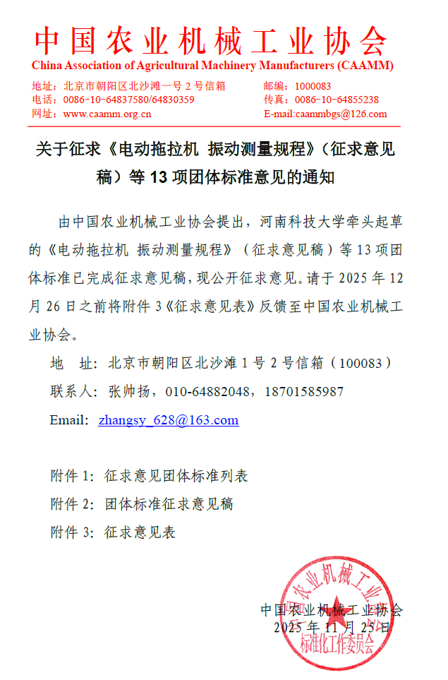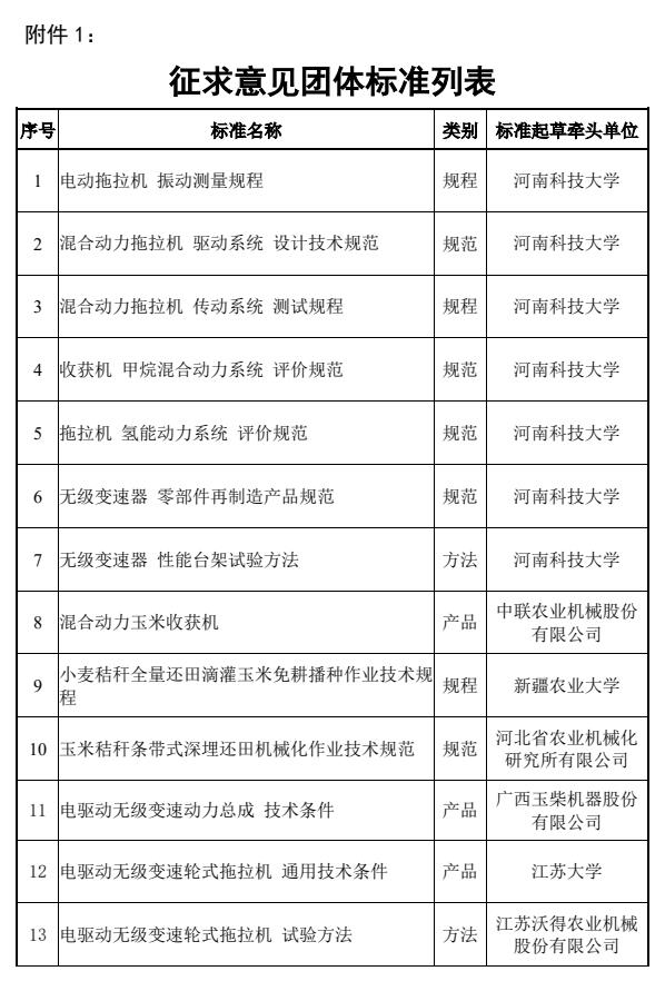 中国农业机械工业协会批准发布《电动拖拉机 行走系 加速耐久试验方法》等5项团体标准的公告。关于批准发布《电动拖拉机 行走系 加速耐久试验方法》等5项团体标准的公告