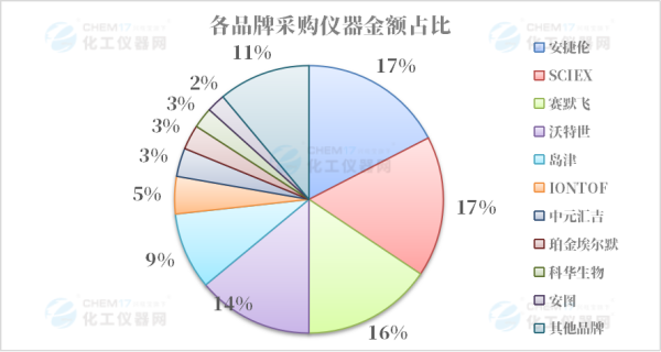 “各品牌采购仪器金额占比”主要展示了中标金额排名前10的品牌,其余归为其他品牌。在10月中标的30个品牌中,安捷伦、SCIEX、赛默飞三个品牌的市场份额依旧占据了“半壁江山”,三个品牌的中标金额共占了总金额的50%,中标金额分别为6913.16985万元、6755.795万元、6194.957万元。