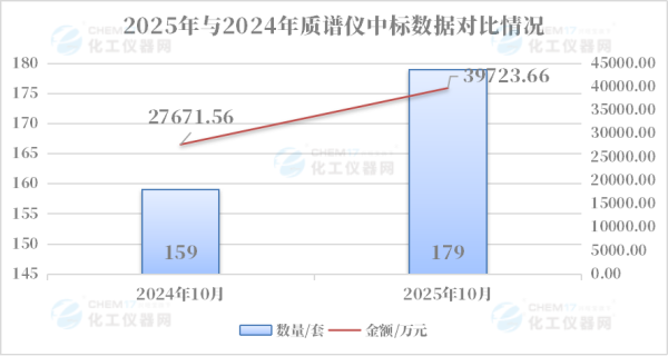 从“2025年与2024年质谱仪中标数据对比情况”中可以看出,2025年质谱仪市场需求依旧持续增长。2025年10月中国政府采购网可统计到的质谱仪中标数量为179套,同比增长12.57%;中标金额为39723.66万元,同比增长43.55%。