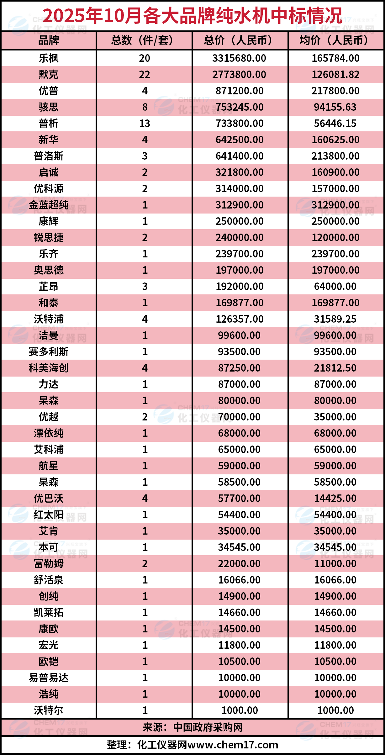 近日,化工仪器网编辑对2025年10月中国政府采购网上的纯水设备中标项目进行了整理。根据化工仪器网不完全统计,10月中国政府采购网上的纯水设备中标项目共93项,除去信息未完全公开的中标项目,可以统计到的成交总数为137套/台,其中在除去不可辨认的产品,品牌及价格可循的中标纯水设备共124套/台,中标总金额达1317.018万元,平均单价为10.62万元。