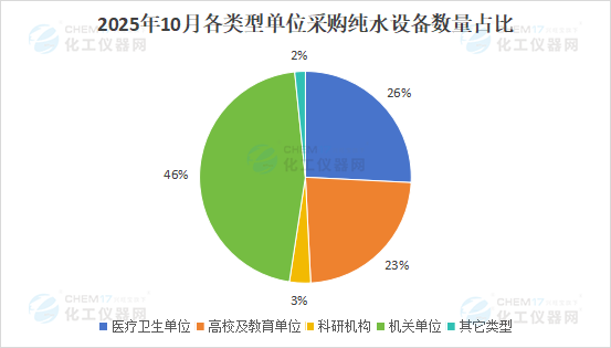 根据化工仪器网不完全统计,10月医疗卫生单位采购纯水设备32套/台,采购数量占比25.81%,采购金额达315.3472万元,占中标总金额的23.94%;高校及教育单位采购纯水设备29套/台,采购数量占比达到了23.39%,采购金额达292.91万元,占中标总金额的22.24%;科研机构采购纯水设备4套/台,采购数量占比达到了3.23%,采购金额达17.57万元,占中标总金额的1.33%;机关单位采购纯水设备57套/台,采购数量占比达到了45.97%,采购金额达673.27万元,占中标总金额的51.12%;其它类型单位采购纯水设备2套/台,采购数量占比达到了1.61%,采购金额达17.93万元,占中标总金额的1.36%。