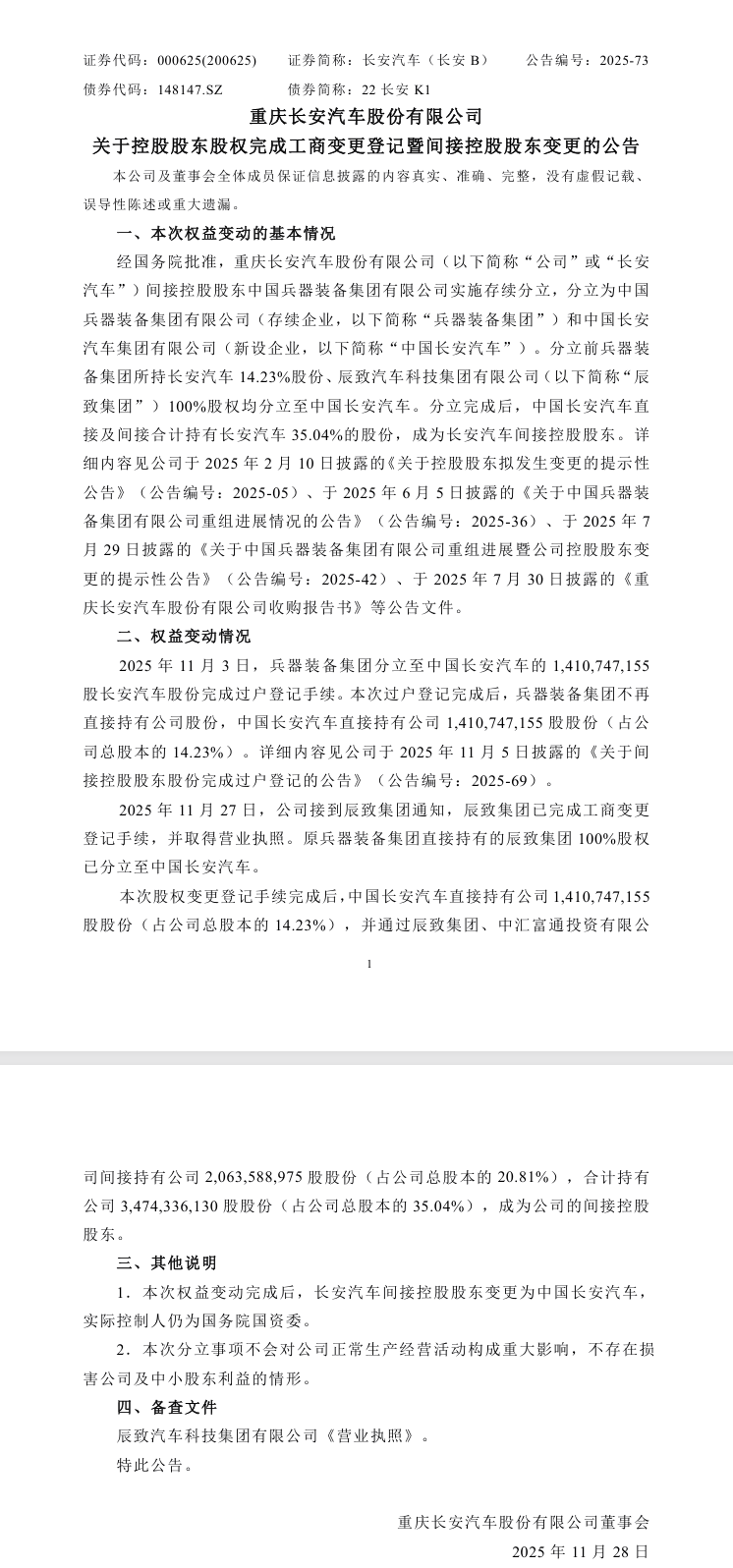 11月27日晚间,重庆长安汽车股份有限公司(简称:长安汽车)公告称,当天公司接到辰致汽车科技集团有限公司(简称“辰致集团”)通知,其已完成工商变更登记手续并取得营业执照,原兵器装备集团直接持有的辰致集团100%股权已分立至中国长安汽车集团有限公司(简称“中国长安汽车”);此前,中国兵器装备集团有限公司(简称“兵器装备集团”)分立至中国长安汽车的约14.11亿股长安汽车股份已完成过户登记手续。