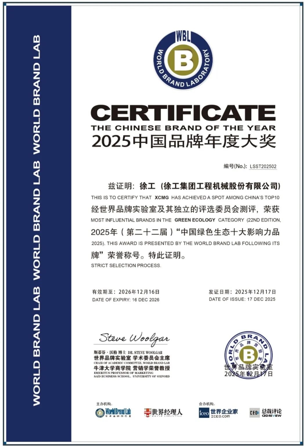 从新能源装备到智能化施工解决方案,从绿色工厂到循环再制造体系,徐工始终将可持续发展融入血脉。“中国绿色生态十大影响力品牌”这一称号,正是对徐工长期投身绿色智造、引领行业向“绿”而行的有力见证。