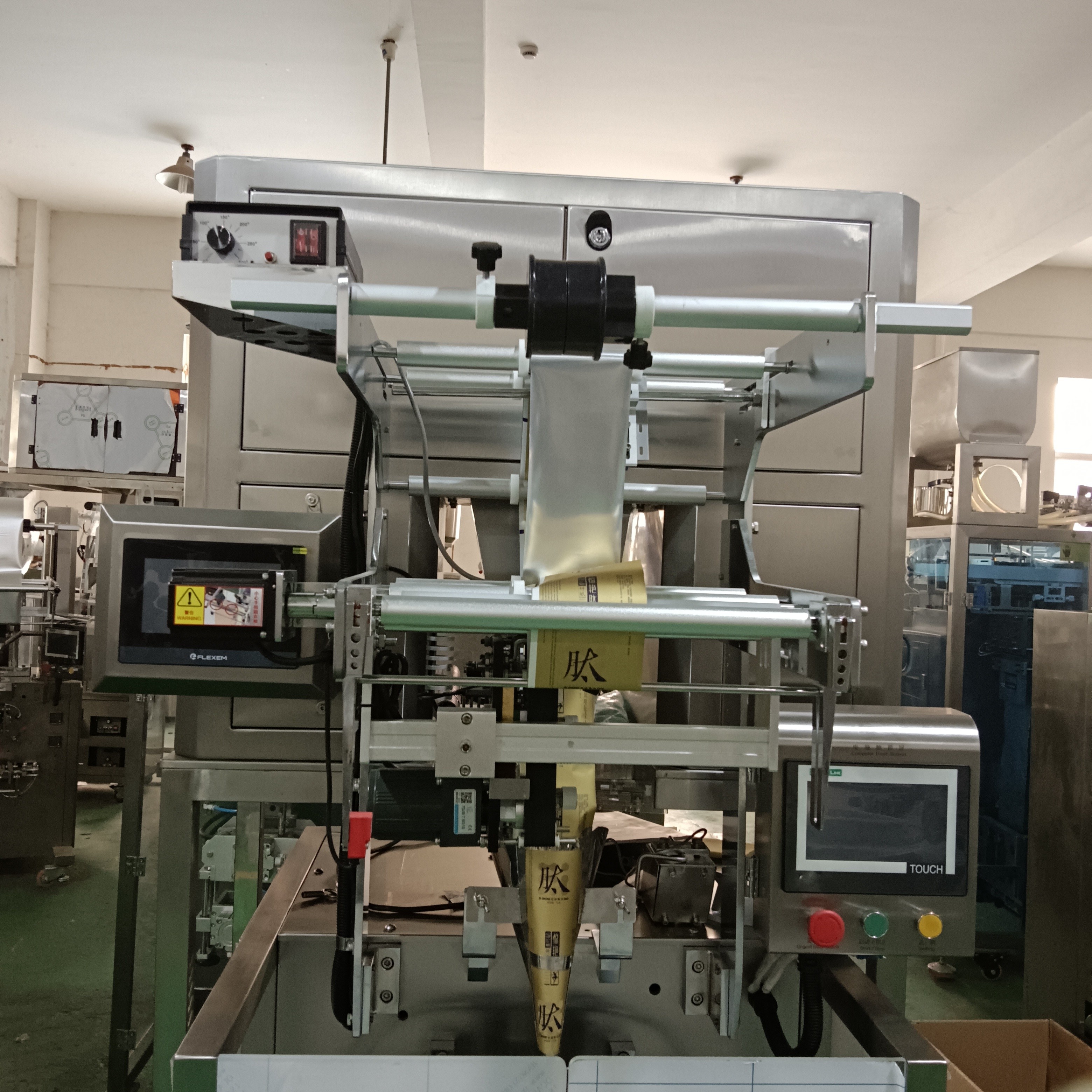 3、触摸屏操作,PLC 控制,驱动步进电机控制袋长,性能稳定、调整方便、检测准确。智能式温控仪,PID调节,保证将温度的误差范围控制在1℃以内。