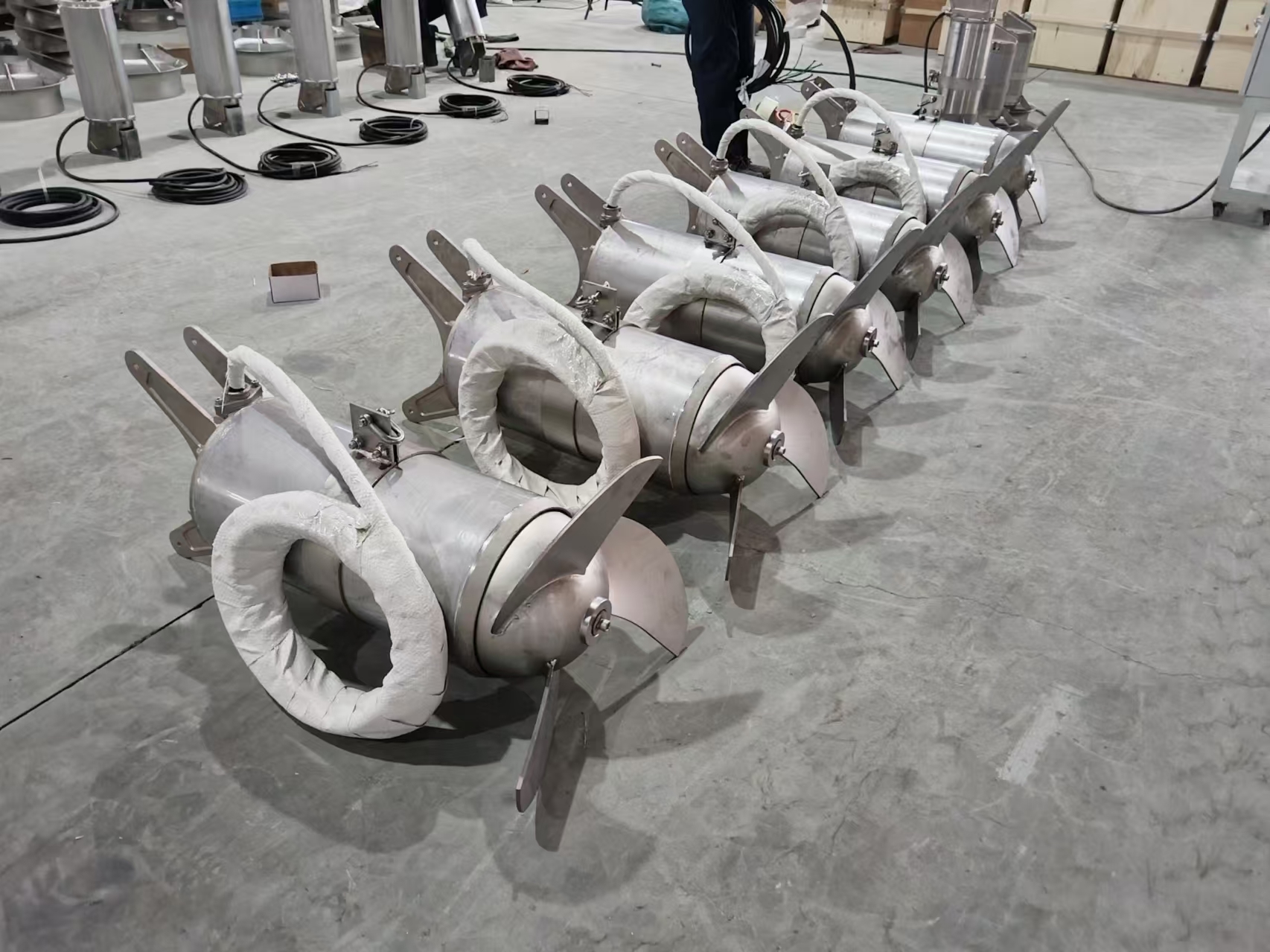 潜水搅拌机是一种新型、高效潜水搅拌机装置,该设备主要由潜水电机、叶轮、导流罩、密封机构、手摇卷扬机构、电气控制等部分构成。搅拌叶轮搅拌液体产生旋向射流,利用沿着射流表面的剪切应力来进行混合,使流场和流场以外的液体摩擦产生搅拌作用,在极度混合的同时,形成体积流,应用大体积流动模式得到受控流体的输送。