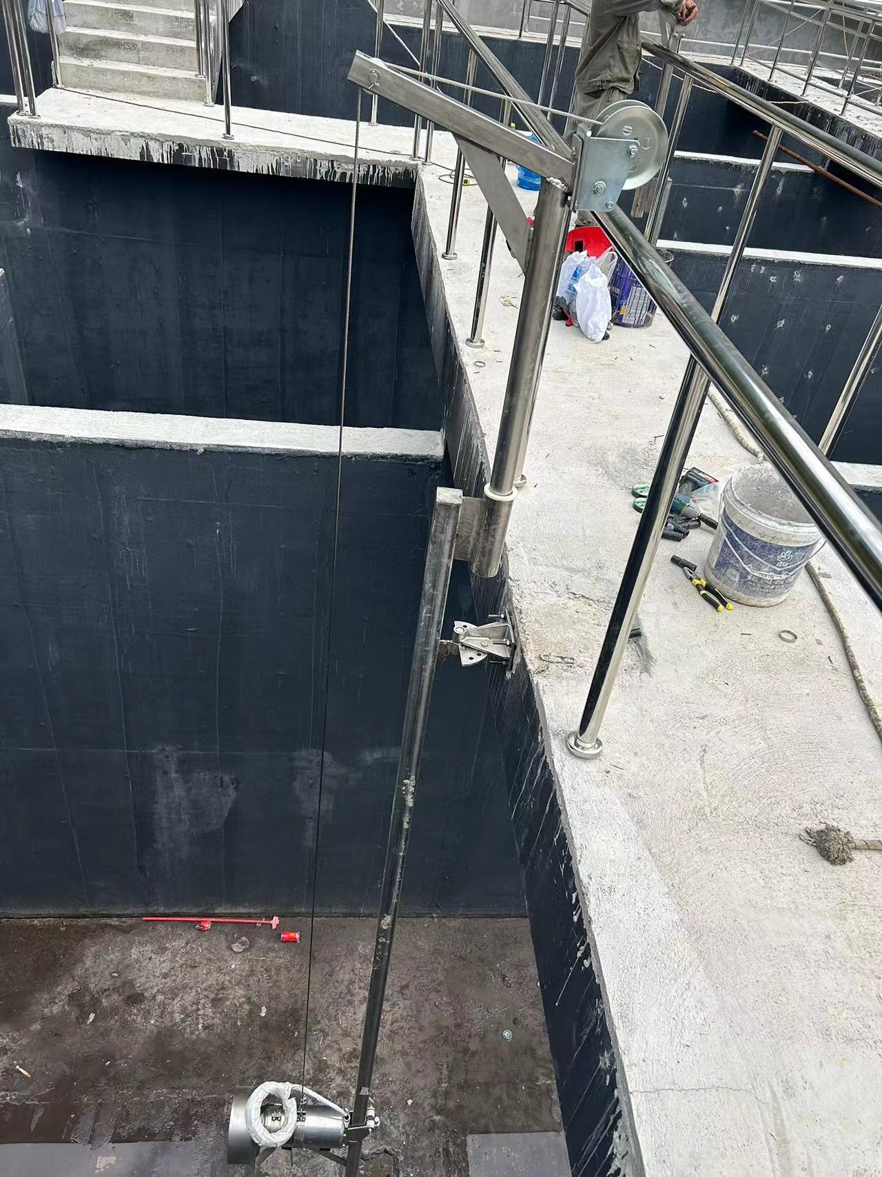当池深H>4米时建议采用安装系统Ⅱ,需在池底做一混凝土基础(或钢结构底座)。起吊系统底座、钢绳固定架和导向底座与池的有关联接面均采用膨胀螺栓固定,无需预留孔。潜水搅拌机安装系统Ⅱ用导向钢绳导杆,具有运输方便、现场安装简单等特点。该系统从根本上避免了由于运输引起导杆弯曲、变形有而影响正常使用的情况,并有效改善了池深过深情况下,由于导杆的安装误差而导致的无法正常起吊等现象。在有悬臂池顶(如图)的安装条件下更显得操作方便可靠。
